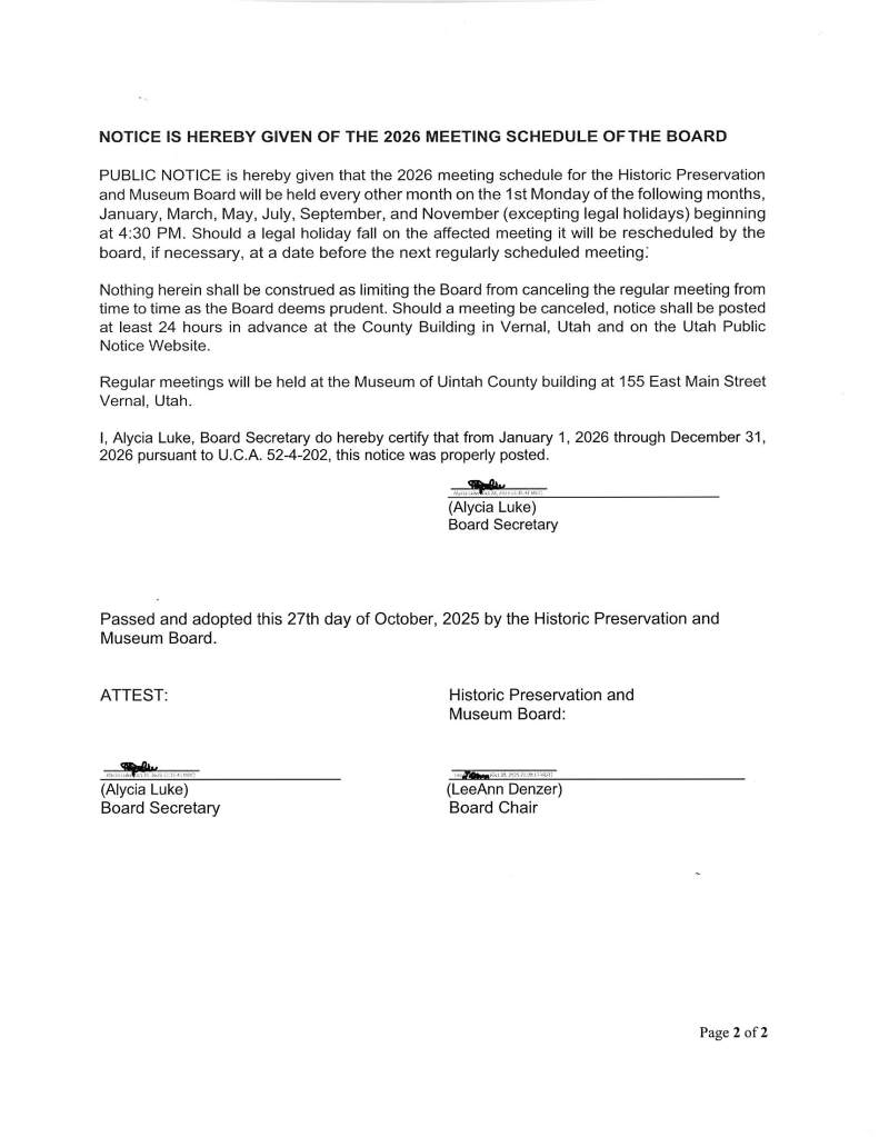 The primary purpose of the board is to advise the Uintah County Commission on matters pertaining to Uintah County Historic Preservation and the Museum of Uintah County. Under the Historic Preservation umbrella, the board adheres to the rules and guidelines established by the Utah State Historic Preservation Office (USHPO). More information can be found on their website. Under the Museum of Uintah County (MUC) umbrella, the board advises the museum on policy.